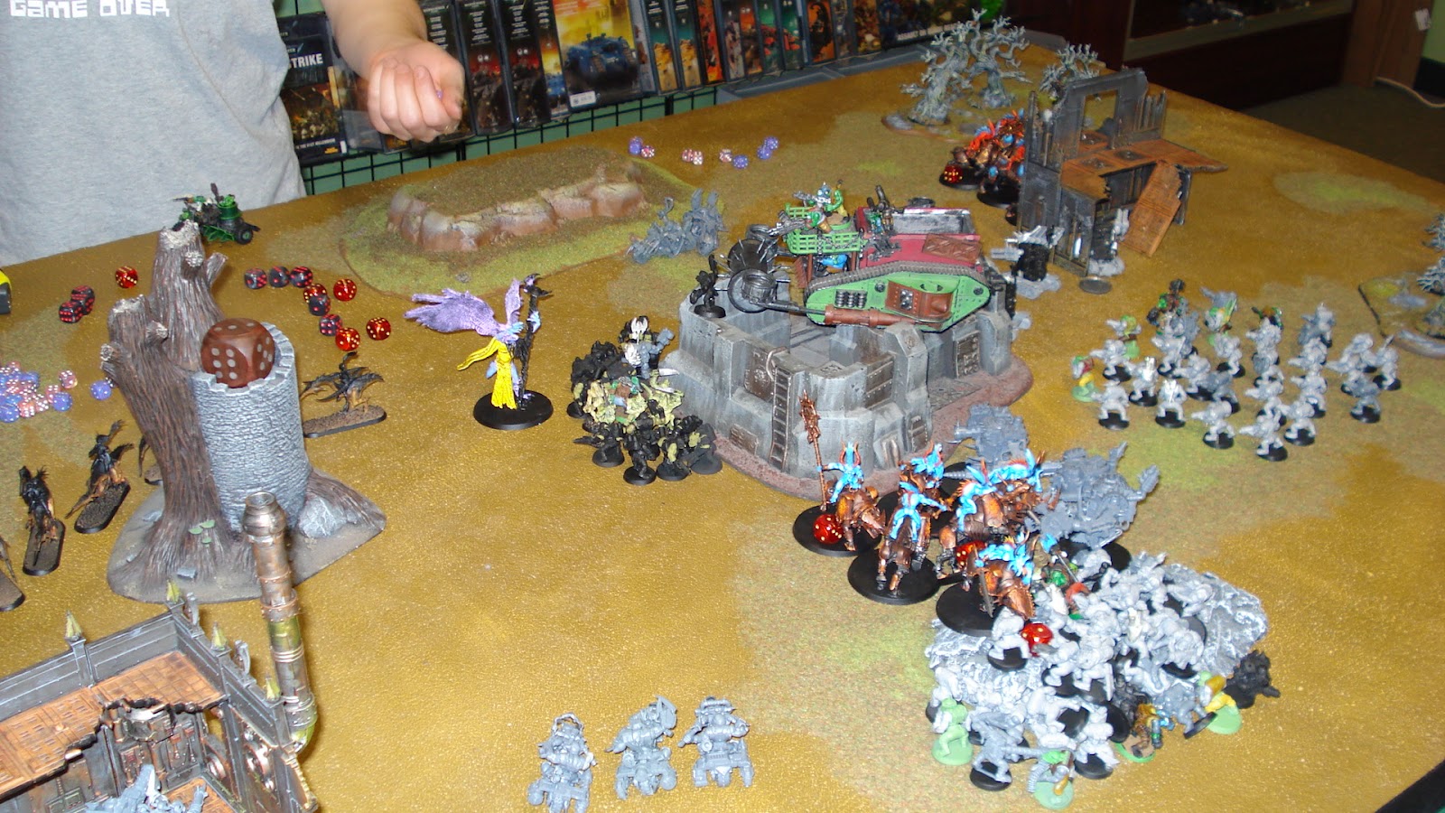 Deamons usually give me fits as they just drop in exactly where they want and usually don't take enough fire to weaken them before they eat me in assault. With Fateweaver giving rerolls to all failed cover, invul, armor saves combined with Ork shooting...going to be problem whittling them down. Fortunately the Kans can hold up several squads pretty well and the battlewagon will provide the deamons with some problems...